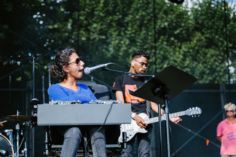 On commence avec Soyuuz, collectif de musiciens de Nantes en situation de handicap... mais cette fois plutôt physique. Evidemment le parallèle est tentant avec Astéréotypie hier, où il était mental : à l'approche des J.O. Paralympiques, il y a comme une sorte de momentum de l'inclusion, y compris dans la programmation de ce festival, et ce n'est peut-être pas une coïncidence ? On parle donc de 6 musiciens, pour la plupart en fauteuil roulant ou assis, et qui jouent un post-punk réjouissant, avec des mélodies accrocheuses ; l'un d'entre eux chante aussi sur certains titres !