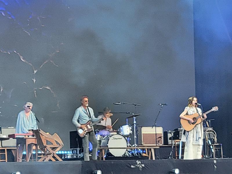 Et puis, parce qu'il faut être un peu sérieux quand même dans la vie, on est surtout allés bien se placer devant la grande scène, pour s'assurer de voir la grande (et justement, petite) PJ Harvey ! Plutôt par acquit de conscience : avouons qu'on n'en attendait pas forcément de miracles, car nos dernières rencontres en date nous ont plutôt ennuyé (sa maudite période de passion pour l'auto-harpe en particulier, instrument heureusement très peu touché ce soir...). Le début nous laisse d'ailleurs un peu mitigés : tombée dans un bain de jouvence (elle ne vieillit et ne change manifestement pas !), mais entourée de musiciens qui semblent plutôt défraîchis, et aux tenues de bardes bleu clair un peu gênantes, elle porte elle-même une robe assez étrange (dont elle expliquera la signification plus tard). Et puis la théatralité dans l'interprétation de son nouveau Prayer at the gate, d'entrée de jeu, est un peu déconcertante en plein jour...