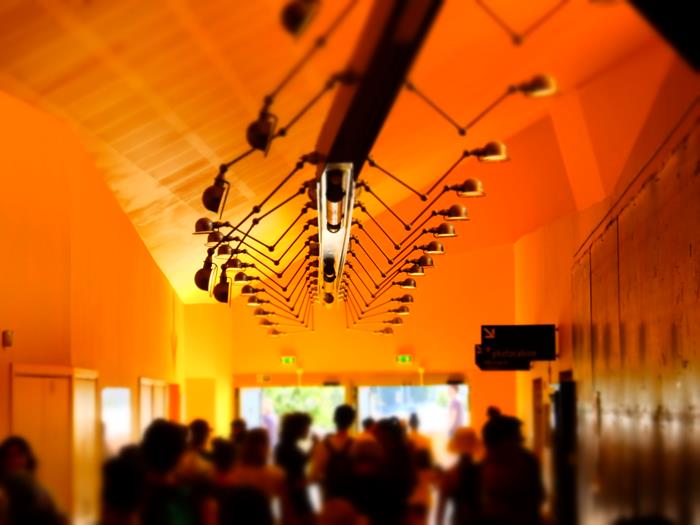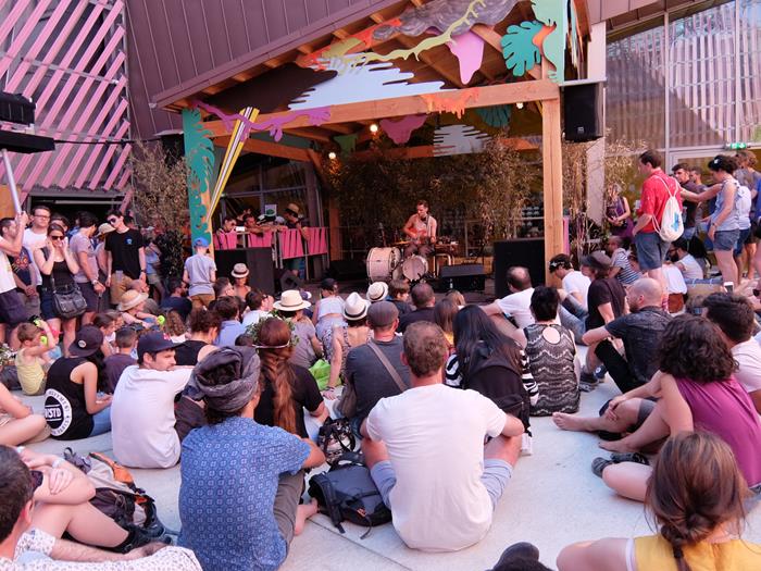 Par contre, le premier concert sera bien à l'extérieur ET à l'intérieur de la grosse bête ovoïde qu'est la Paloma, en son ouverture carrée et centrale du patio. Autrement dit l'endroit le plus frais et ombragé en ce milieu d'après-midi caniculaire, pour rejoindre Bror Gunnar Jansson, qu'on a quitté il y a quelques semaines à peine à Marseille ! Son concert avait été annoncé pour les enfants - et pas mal de minuscules semblent avoir profité de la gratuité de l'après-midi pour y amener spécialement leurs parents, à en voir la concentration de petits casques verts et autres têtes juvéniles couronnées de fleurs... Une charmante scène en bois a donc été installée, le bar et les gradins tendent aimablement les bras aux festivaliers assommés de chaleur et de soif... que nous sommes déjà, quitte à les inciter à la dissipation...