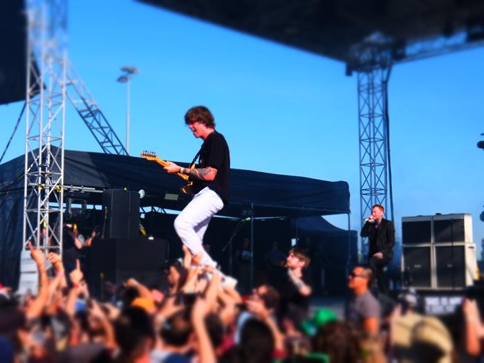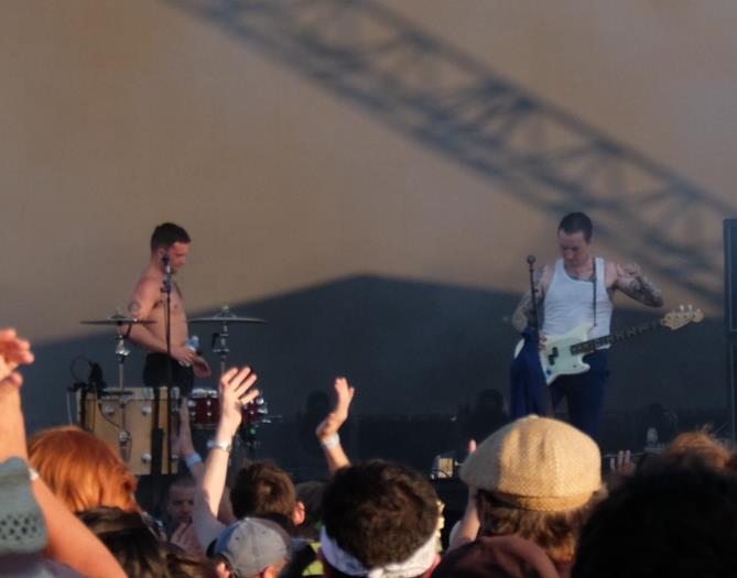 C'est le moment des Slaves, le climax attendu de l'aprème, notre p....n de révélation sur scène, puis sur disque de 2015, et qui continue son petit bonhomme de chemin. Assez rapidement, les deux petits lads marrants en arrivent à l'énorme Sockets, dont Joshua adore le clip, puis la basique et jouissive Fuck the Hi-Hat. Eux aussi sont super sympas et viennent faire des mamours à la sécurité, comme Franck Carter avant eux... Et leur petit chanteur bavard se baladera un moment dans le public pour parler de baston entre filles, entre deux footings effectués en jouant de sa batterie. Il peut être serein : ce n'est pas dur de cartonner avec des titres jouissivement basiques comme Spit it Out ! Leur premier tube Cheer Up, London ! a une résonance particulière pour nous : si le titre, joué dans le rouge mais toujours jouissif, déplore le tirage de gueule habituel des Londoniens, nous avons aussi pu apprécier sur place la semaine dernière leur flegme, efficace résistance naturelle face à une attaque terroriste...