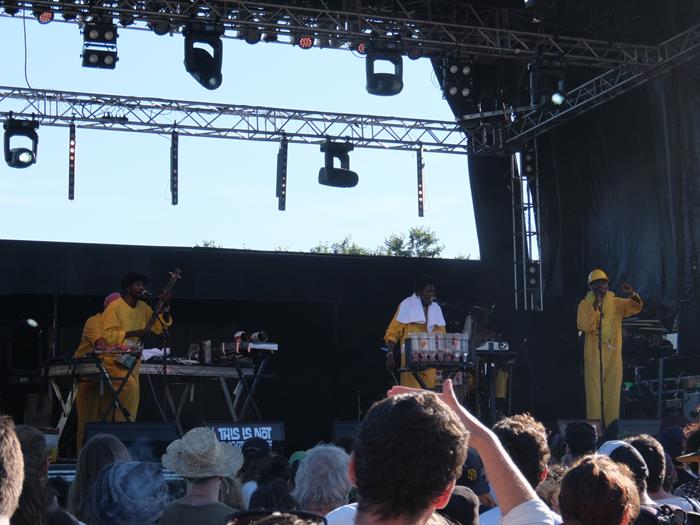 On reconstitue notre petit groupe autour de la fin des Kokoko, sur la nouvelle scène Bamboo, qui alignent des costumes Devo-style et des instruments bricolés main (par exemple une sorte d'orgue en bouteilles d'eau plus ou moins pleines, joli son !), pour une musique dansante voire pétaradante, afro-électro, dans une ambiance survoltée par un frontman joyeux. A revoir à l'occasion... ils sont de la même matrice que les Staff Benda Bilili ! Tout comme cette brave canadienne Laura Sauvage serait à réécouter éventuellement, elle qui avec son groupe essaye avec un certain succès d'imiter Courtney Barnett (en jouant moins fort, heureusement). L'avantage des groupes venus du froid étant que le soleil les met de fort bonne humeur. Alors que nous, horribles blasés régionaux, nous en sommes déjà à pester contre cette canicule, avant même le début de l'été...