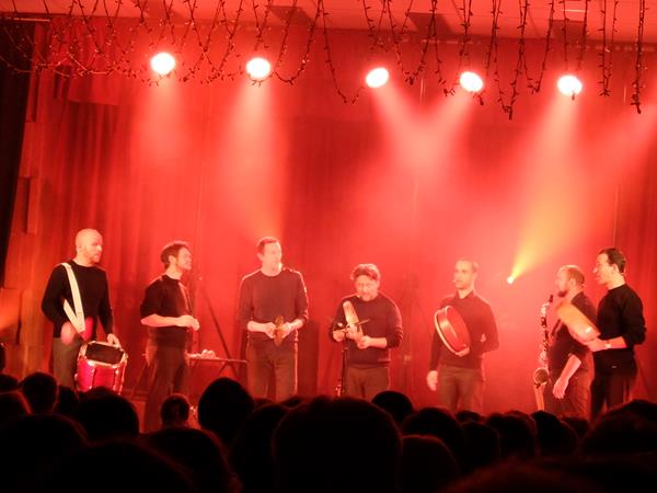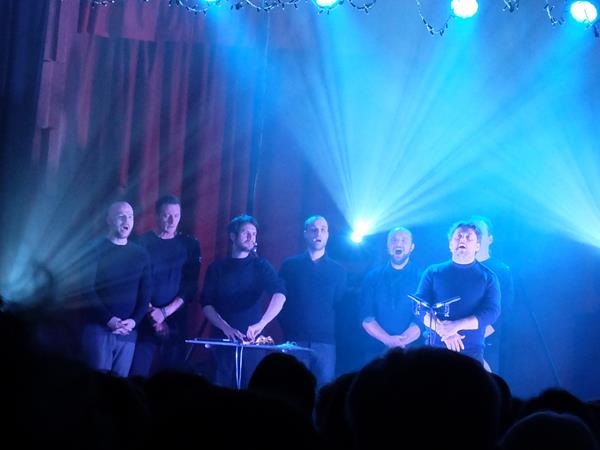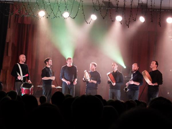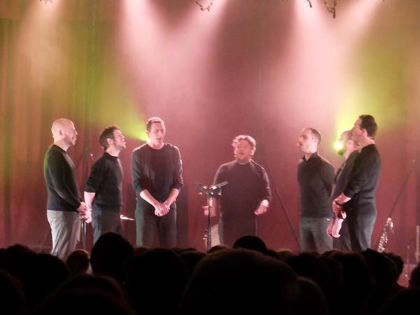 Et voici donc entrant par la porte du fond, suivant un fifre et un tambour, les 5 sémillants choristes venus nous chanter la (plus ou moins) Bonne Parole, non sans la tordre un peu à leur sauce iconoclaste. Car si les 5 chanteurs de Lo Cor de la Plana interprètent magnifiquement, et avec un respect infini, le répertoire en langue d'Oc (qui va du Piémont jusqu'à la Catalogne, voire au Pays Basque, en passant par notre belle Provence... et l'on va ce soir visiter plusieurs de ses nombreuses provinces), ils ne se gènent pas pour en booster avec une certaine hardiesse les instrumentations, via leurs invités, au risque de secouer un peu certains papis et mamies dans la salle ! Entre saxo basse vibrant, fifre sautillant (joués à deux en même temps bien sûr), tambourins festifs et même table de DJ pour quelques notes et boucles électroniques, on peut dire que le répertoire est sacrément ragaillardi... La salle finira d'ailleurs pour partie debout, en faisant des pieds et des mains pour accompagner leur joli raffut dans une ambiance tout à fait festive, proche d'une tarentelle !