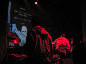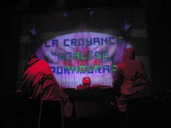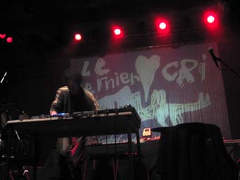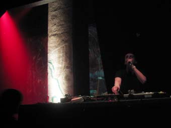De l'électro expérimental extrême officiel pour le néophyte que je suis à apprécier à sa juste valeur. Il est vrai que ce soir il ne détonnait pas du tout dans ce lieu et au milieu de toutes ces images on ne peut plus trash. Cela dit même si sa musique en tant que telle est difficile d'accès, le voir sur la scène trifouiller ses machines, scratcher, changer ses disques a toute vitesse et les jeter par terre, lever une jambe, son visage se torde presque de douleur ... est assez distrayant.