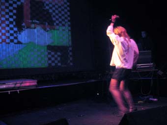 2 gars au machines complètement sur al droite (un au son et un aux images je pense) et au milieu de la grande scène vide une chanteuse qui m'a instantanément faite penser a Peaches. Effrontée, provocatrice, un rien aguicheuse et trash elle était vêtue de collants léopards, de talons haut, d'une mini jupe noire, d'un haut blanc un peu vieillot et d'une coupe a faire pâlir de jalousie la plus hypster des hypstes de Brooklyn.