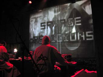 Puis ce fut la projection de la deuxième partie des Religions Sauvages (le film) accompagné en live par 3 musiciens. De gauche a droite à la batterie Cyril Bilbeaud (oui oui l'ex Sloy et l'une des raisons de ma présence ici ce soir*), Paquito (l'un des gourous de la secte du Dernier Cri présent donc ce soir sur l'écran et sur scène aux machines) et un troisième bonhomme (dont j'ignore le nom) lui aussi aux machines ...