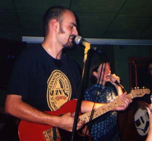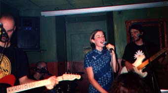 Arrivé à l'Intermédiaire la salle était bien pleine, et la température du coup assez insupportable. A 22h30 ils ont attaqué. Ils sont 4 : un batteur (jean Phi) celui du bas sur le tract avec la petite mèche, un guitariste (avec la barbe), un bassiste (le 3ème) et une chanteuse qui a l'air très sage à première vue. Je comptais rester une bonne demi heur et finalement j'ai été tellement emballé que je suis resté tout leur premier set. C'est incroyable la bonne humeur qu'ils dégagent. Première constatation ils ne font pas de la fusion funk ! Ou en tout cas pas que. Ils sont capables de passer de la samba au rock n' roll, tout en faisant un tour par le gospel, sans oublier le hardcore (à des moments où on ne s'y attend vraiment pas) et ce avec une homogénéité et un naturel déconcertants.
