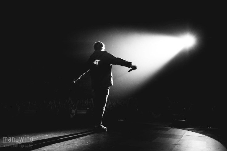 Le Zénith est plein, mais relativement calme, avec des spectateurs de tous les âges. Je craignais faire partie des vieux, mais il n'en est rien. Orelsan fait donc son entrée seul sur scène avec un magnifique maillot gris de l'équipe du Stade Malherbe de Caen (3ème maillot ou maillot gardien je dirais). Il entame son set par Jour meilleur et La quête, ses 2 derniers singles, bénéficiant tous deux de très beaux clips : le 1er pour rappeler pourquoi la Normandie est magnifique, le second pour l'énorme boulot pour rendre tout si joli en pâte à modeler. Aucune mise en scène, on est entre amis et la lumière reste même allumée, ce qui peut surprendre dans une si grande salle. Accessoirement, dans la fosse, on a donc du mal à bien voir (oui, on est petit). 4 lumières type salle des fêtes ensuite pour Défaite de famille, malheureusement coupé avant la fin par une pseudo panne pour envoyer du lourd par la suite. Dommage, c'est bien d'entendre les titres en entier.