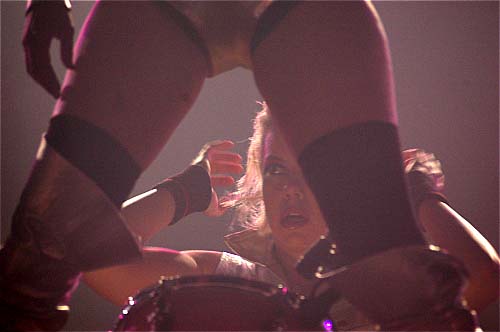 Bref, Peaches dans toute sa splendeur sexy-kitsch : à moitié nue, sous-tif et culotte flashy...Moi, ni ça ne me fait rire, ni ça m'émoustille mais je note l'effort...Elle est accompagnée par des musiciennes, dont une batteuse et un androgyne sur un des 2 claviers, qui ressemble étrangement à la femme à moustache de Le Tigre (groupe dispensable)... ???