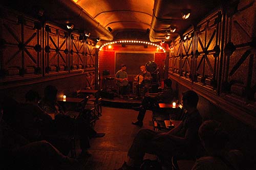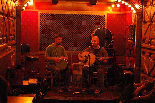 Nous pouvons donc jeter un oeil et une oreille a la fin du set de Okbaru duo de "Armenian and Anatolian Folk Music" ... du Maine. L'intimite du lieux (qui me fait toujours penser a la fin d'un bus) allait tres bien avec la musique de Amos Libby au luth et Eric LaPerna a la derbouka.