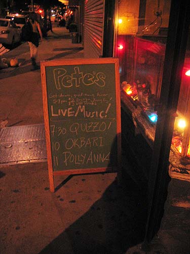 Je dois avouer que quand j'ai appris que Pollyanna jouait a Brooklyn la semaine ou j'etais de passage ca m'a beaucoup amuse. En effet Pollyanna en solo comme ce soir c'est Isbaelle Casier ex chanteuse de John (groupe marseillais qui a connu son heure de gloire il y a maintenant deja 10 ans !). Ne l'ayant pas revue depuis cette epoque (et son depart a Paris) je ne pouvais pas la rater ce soir, aussi apres avoir diner avec Svet et ses parents dans le coin nous arrivons a Pete's Candy Store un peu apres 22h ...