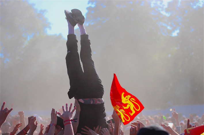 Par contre, on a beaucoup moins aimé le manque d'herbe et donc forcément un trop plein de poussière par moment, mais pas tout le temps et surtout le tarif des boissons, de la bière notamment (8 euros la pinte de 50cl) sans être vraiment de qualité dans la plupart des cas, le coût de la nourriture au prix exorbitant qui fait qu'on pouvait craquer facilement 40 à 50 euros par soir (pour les festivaliers, ça fait un vrai budget surtout s'ils viennent en famille). A leur décharge, on souligne la belle initiative des GO d'offrir la gratuité du billet aux enfants de moins de 12 ans. Pour nous les privilégiés, on aurait bien aimé trouver un fast-food vu les journées intenses que l'on vit en festival et pouvoir manger comme un guerrier du bon, gras et chaud. Car les apéro-dinatoires et le restaurant classieux proposés en guise de restauration dans l'espace dédié aux partenaires et invités en tout genre, correspondent plus aux mondains qui aiment boire leur coupe de champagne et se montrer. Pour finir, on n'a pas trop vu de craquage au niveau costumage dixit un festivalier, mais on se souviendra d'un couple avec des bouées bleues de drôles d'oiseaux et de trois copains en manteaux de fourrure.