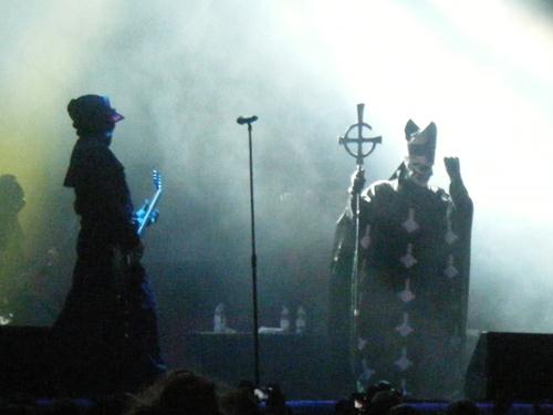 Après l'impossibilité de s'approcher de Fauve l'an dernier aux Eurockéennes, on a pu se rattraper à Marsatac dans une salle de taille moyenne : c'était plaisant une fois, okay, mais pas grand chose à voir sur scène. Contrairement aux affreux jojos suédois de Ghost, dont la musique assez atroce est totalement raccord avec leurs costumes : il s'agit bien ici d'un show ! Et pourtant la farce va rapidement tourner court, surtout parce que l'"antipape" du groupe chante vraiment, mais alors vraiment, comme un baltringue. La comparaison avec Robert Plant serait vraiment trop cruelle mais, bon, il se trouve qu'on en a encore plein les oreilles. Ca et le fait que leurs compositions sont de metal standard dans le meilleur des cas (quelques bons riffs), mais peuvent aller jusqu'à la pop embarrassante. Voire même au slow catastrophique ("On dirait pas les Scorpions là ? - Non, plutôt Europe !"). Le tout avec le gimmick facile et répétitif d'insérer des choeurs d'église (pré-enregistrés) pour faire bonne mesure.
