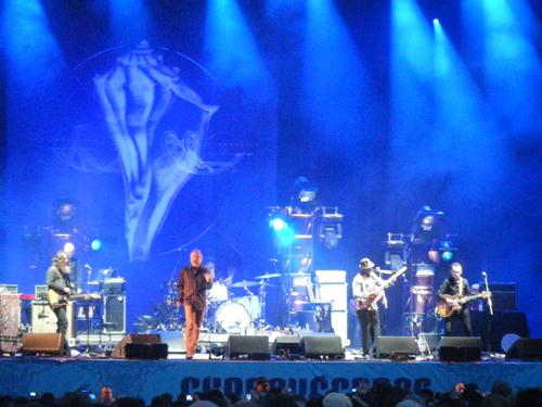 Sainte Merde, on aurait pourtant du s'en apercevoir.... C'est vrai que la version acoustique/flamenca de Babe I'm Gonna Leave You qui ouvre le concert, est déjà superbe. Mais quand son groupe se déploie, on approche rapidement de l'extase : on note à la volée que le 2e titre ressemble à du (très bon) Massive Attack, genre space et avec basse tellurique (et pour cause, il nous le dira ensuite, il leur a piqué un membre !). Les Sensational Space Shifters comportent aussi, entre autres, un guitariste chevelu/barbu dont certains riffs sonnent à vous en donner le frisson de joie, un pianiste blanc parfait à son poste, un gratteux noir à chapeau qui joue manifiquement de multiples instruments du cru (la base étant une calebasse à une ou deux cordes maximum, jouée à l'archet). Le groupe tout au service du héros honore donc l'esprit du Led Zeppelin (l'ombre du dirigeable flottera agréablement au dessus de nos têtes tout le concert...), et donne un écrin magnifique à sa voix. Le tout étant dédramatisé presque entre chaque titre par une boutade de Robert Plant (exemple, une tentative désinvolte de vendre son prochain album, conclue d'un "Fuck you !" rigolard), qui n'oublie pas non plus de relancer l'ambiance en se servant de nos quelques 50 000 mains enthousiastes...