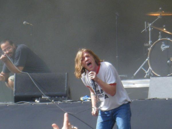 Il faut dire que le chanteur, qui paraît en chewing-gum, a un très gros abattage, et que lui et les déjà traditionnels slammeurs en costume Spandex (vert et orange, cette fois-ci) mettent un beau bordel en fosse. Quelques titres plus calmes (Flow, un peu longue) font retomber l'ambiance mais lui permettent de reprendre son souffle, avant le climax attendu, la terrifiante et jouissive Indy Kidz, qui ne rappelle rien d'autres que les premiers essais de Nirvana ! Autre style, Ain't no rest for the Wicked, très hip-hop, puis leur déjà presque classique Shake me Down, réussite majeure ! Sabertooth Tiger achève de nous convaincre que ce groupe a une formidable palette de titres allant du plus calme au plus furax, en passant par de vrais moments mélodiques (Right before my Eyes) : des athlètes complets en somme, à revoir plus expérimentés sur scène, et à chroniquer en disque ASAP en attendant !