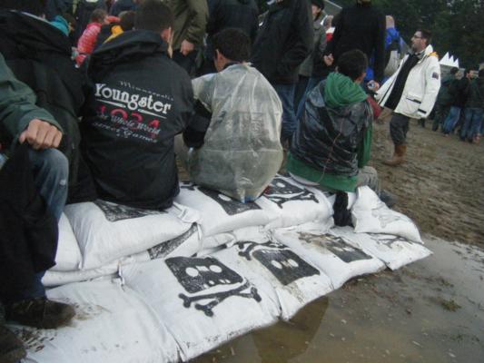 Fort heureusement on tombe directement sur nos camarades accrédités de Concertandco : Flore-Anne et ses appareils sophistiqués, Pierre et ses bières diaboliques... De quoi se remettre de bonne humeur d'autant que la pluie a finalement décidé, après nous avoir poursuivi dans toute la France et avoir totalement ruiné le site du Fort de Saint-Père, de nous lâcher un peu les baskets. Qu'on aura donc rapidement pleines de boue mais enfin, on a pied partout... Et notamment sur ces banquettes formées de sacs de sable aux couleurs du Festival, excellente idée qui permet, de temps en temps, de pouvoir poser ses fesses quelque part. Le site est de petite taille et tout est bien indiqué : en 5 minutes, le néophyte y a trouvé ses marques, pour se remplir comme pour se vider.