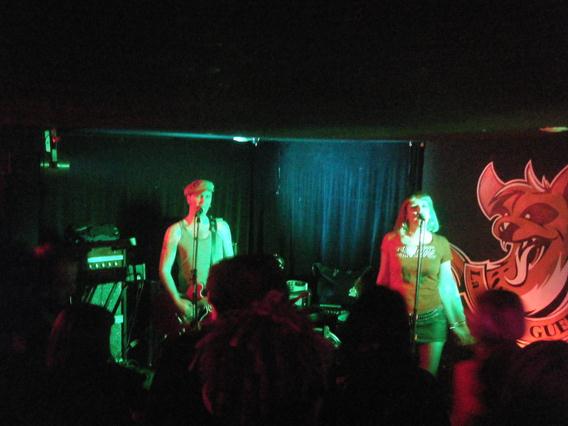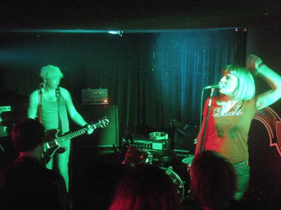 Rock assez guilleret, voire un peu pop-rock, conjugué à la batterie au son clair, le couple est poseur juste ce qu'il faut, avec des attitudes rock'n'roll impeccables. On dirait une sorte de version propre des Cramps, ou à la limite nos Dirteez locaux à jeun et en 1994 ... A un moment, un genre de delay sifflant s'impose à la guitare qui, curieusement, ne leur plaît pas (alors que le public y trouve le petit côté crado qui lui manquait). Qu'à cela ne tienne, le sifflet coupé à la pédale fautive, ils enquillent leurs trois derniers titres, les plus efficaces à notre goût, mention spéciale à Dead Cool et Tiger Witch... Au final, on a certes pas réinventé ici la machine à courber les bananes, mais au moins la banane, on l'a mise à tout le monde. Beau travail, et torché en 30 minutes !