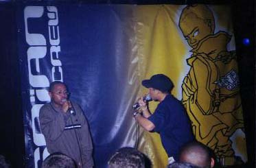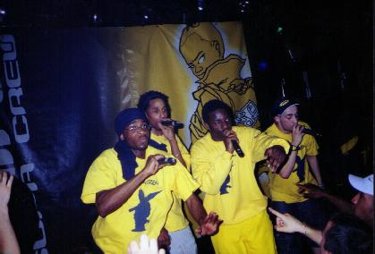 Très peu de temps après (pas d'instruments à (dés)installer sont arrivés en fracs les 6 membres du Saïan Supa Crew habillés en jaune et bleu (sur les tracts il était inscrit Tenue Jaune exigée, mais ils ont quand même laissé rentrer tout le monde : ). Ils sont très actifs sur scène, sans platines, ni DAT (juste un vague beat de temps en temps, tout le reste ils le font à la main, enfin plutôt à la bouche. A la manière des Fabulous Trobadors ils imitent très bine les scratchs, les platines, et autres sons du hip hop. Ils ont réussi à nous tenir en haleine pendant près d'une heure et demi avec leurs chorégraphies, leurs textes politiques (au sens propre), leurs sketchs (qui m'ont fait penser à Courtemanche). Visiblement ravis d'être ici et portés en triomphe (avant même d'entrer sur scène, le public hurlait déjà SAIAN, SAIAN, SAIAN !) ; ils ont eu aussi beaucoup sollicité les cordes vocales du public ainsi que les jambes (jump !)