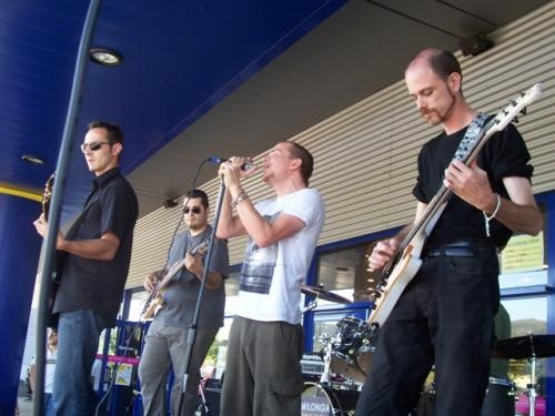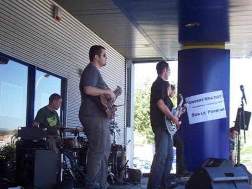 Dehors, le groupe suivant va proposer un contraste saisissant : boissons fraîches, climatisation, Zen TV inside, parking sans ombre, groupe de métal outside : Middle Think commence par un titre où le chanteur (Sébastien) fait tout pour se casser la voix mais n'y parvient pas tout à fait. Ses camarades (Nicolas / basse, Romain & Gaël / guitares, Franck / batterie) font du bruit et plaisir à voir mais le métal, ce n'est pas mon truc alors je vais faire court. Pour me faire plaisir, ils ont enchaîné par deux titres plus soft (le second excellent !) et puis Sébastien a dit "on n'en a plus" comme pour s'excuser. Il a alors continué son chant en surrégime sur des orchestrations très musclées et bien carrées. Un répertoire surréaliste sur un parking de supermarché un samedi après-midi. J'ai apprécié le riff de guitare de Needs malgré une impression de déjà entendu.