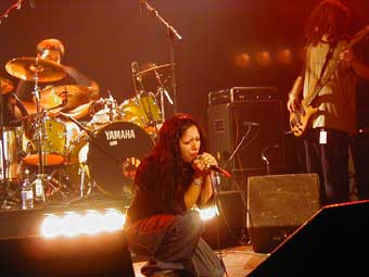 Dans le noir, un sample genre chant religieux à la Enigma et puis tout d'un coup (au moment où je prenais une photo) un gros flash et un énorme bruit : et c'est parti ... sur scène ils sont 5 : un batteur assez imposant dans le fond, un guitariste à droite à côté d'un grand bassiste dreadlocké, à gauche un autre guitariste / choriste et au centre la fameuse chanteuse (et oui une fille !). C'est parti à fond et tout de suite elle a commencé à rugir comme bon nombre de ses groupes de métal hardcore (j'ai encore mal à la gorge d'y repenser : comment peut on tenir une demi heure en chantant comme ça ?).