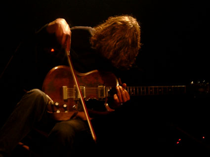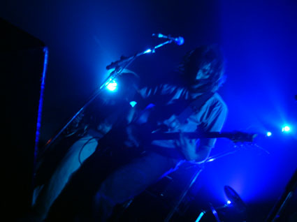 Beaucoup de personnes désiraient assister au set de Makoto Kawabata & Jean-François Pauvros pour tester la solidité de leur système auditif et apprécier les improvisations soniques du duo expérimental. On nous avait annoncé 6 amplis sur scène et orage au désespoir (sic), la scène du Pocoloco ne comportait que quatre amplis. Ils s'avéreront largement suffisants et on se demande encore comment les personnes aux oreilles collées aux baffles et non protégées ont pu tenir sans s'évanouir !