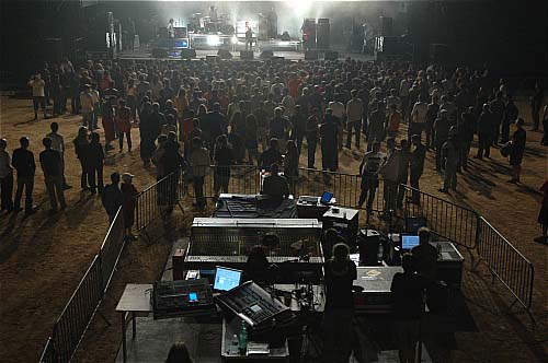 La scène, impressionnante (10 mètres de haut, large de 15), occupe la moitié des arènes... heureusement... Quelques uns sont devant, la plupart des spectateurs sont montés dans les gradins pour siroter une bière et taper la discute... Derrière eux, des banderoles de pub pour Europe2 TV.