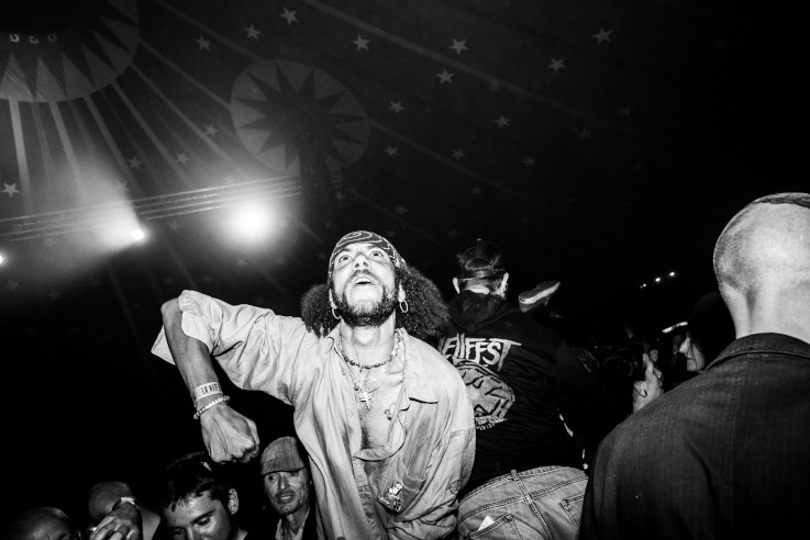 C'est le genre de truc idéal pour organiser des séances de yoga pour se reconnecter à son moi profond, heu non, pardon, plutôt des séances de pogos et de slams (on voit même passer au dessus des têtes le bassiste de Frustration, Pat) pour se défouler comme un gentil taré. Ce qui fait que le public, à fond, est très, très énervé (positivement). Déjà bien chaud, il est galvanisé de surcroit par un mec qui a l'air de faire partie de l'entourage du groupe et qui monte sur scène, harangue la foule et se jette partout. Voilà, c'est le souk, et chaque titre est plus excitant et joué serré (ces gars sont des sauvages qui doivent répéter tous les jours) que le précédent.