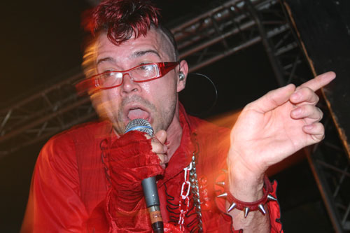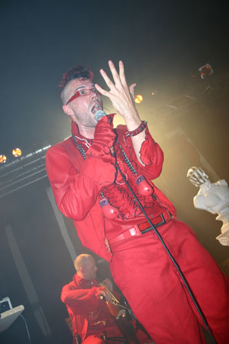 Il n'y avait pas de chaudrons sur la scène du Point éphémère, mais quelques crânes, une mâchoire, des fourchettes en plastique, des oeufs aussi en plastique et un démon, en chair, en chaînes et en os, avec une crête rouge. Ce diable de rapper, c'est Dose One. On l'a déjà aperçu tout à l'heure aux côtés de Jel, dans le rôle d'un discret joueur d'harmonica. Cette fois, il revient tout de rouge vêtu avec quatre autres musiciens, en rouge aussi, de pied en cap. On retrouve là Jel aux machines, Marty Dowers au clavier, à la flûte et au saxophone, ainsi que deux autres, encore pas vus jusque ici, Jordan Darlymple, à la batterie, guitare et xylophone, et Alexander Kort au violoncelle électrique.
