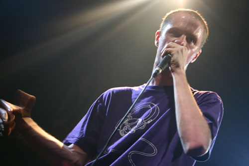 La voix nasillarde de Dose One, son flow intarissable, son festival de pitreries sont au centre du dispositif de Subtle. Dose décrit un univers assez effrayant proche des tableaux de Salvador Dali ou des textes des Butthole Surfers. Même écrites noir sur blanc, ses paroles sont totalement incompréhensibles. Il y est souvent question de notre corps, dont il égrène les organes au fil des rimes. Sur scène, on peut le voir ainsi parler à un crâne, avant de l'ouvrir et de regarder ce qu'il y a à l'intérieur. Il jongle avec le macabre, mais le spectacle ne verse jamais dans le gore ou le gothique. L'humeur générale est à la légèreté, à la comédie, à la poésie et à la taquinerie. Quand il ne parle pas à ses crânes ou à ses fourchettes en plastique Dose vient s'asseoir au bord de la scène pour plonger ses yeux, voire ses mains dans le public. Tenez par exemple, il m'a tiré les poils de la barbe. C'est la première fois que je vois ça. Un chanteur qui me tire les poils de MA barbe ! Et ce n'est pas tout, il m'a aussi accusé d'avoir volé un sac rempli d'argent. Publiquement. Devant témoins. Et de préciser qu'il ne faut jamais faire confiance à un type avec un appareil photo. "Never trust a guy with a camera", en V.O. Je n'ai pas été la seule victime de ces insinuations délirantes. Tout le premier rang y est passé. Les uns après les autres, il nous a fait les poches à la recherche de ce fameux "bag full of money".