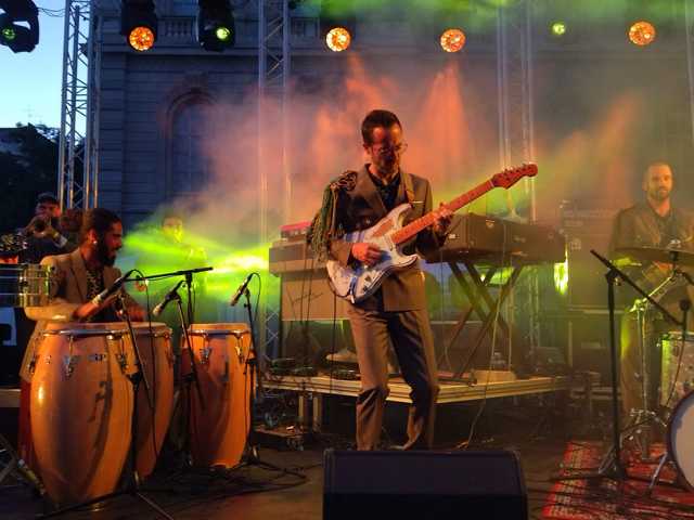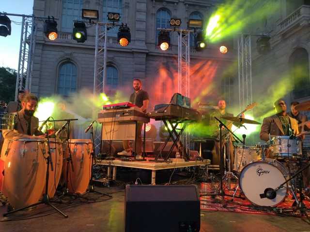 Ils sont sept sur la petite scène : cuivres, percussions, claviers, guitare, basse et un batteur/chanteur qui va s'employer assez facilement à encourager les fêtards à crier, taper des mains, danser.