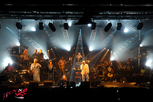 Changement d'ambiance et retour au calme (?) avec Mory Kanté, tout de blanc vêtu, capeù sur la tête et classe jusqu'au bout de la guitare.
