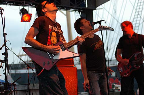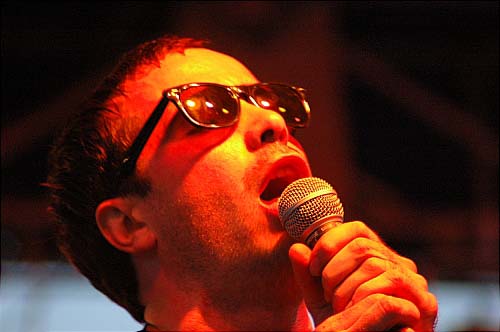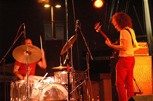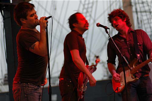 Apres 10 nouvelles minutes pendant lesquels Ted Leo et les siens ont installé leur matériel eux même, ils ont enchaîné direct. Apparemment c'est leur 5eme passage à ce festival. Moi je les avais déjà vu en plein air, dans un festival gratuit, mais c'était celui de East River Music au East River Park, en compagnie notamment des feu-Sea Ray. Ted s'était changé tout en blanc (avec un pantalon légèrement trop court), Dave a la basse a les cheveux qui ont pas mal poussé (genre Led Zep) quant a Chris a la batterie sa barbe est toujours aussi impressionnement fournie.
