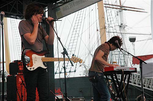 Non vraiment y a des fois ... rien a faire de la journée au ou presque et je me débrouille pour partir a la bourre de chez moi et du coup rater le premier groupe. En effet je pars du Upper east side vers 18h10, soit 10 min après le coup d'envoi officiel de cette avant dernière soirée de concert gratuit a south street seaport. Il a plu abondamment pendant la journée mais ça a l'air de s'être calmé. J'arrive là-bas le dos plus ou moins trempé, accroche mon vélo en vitesse et me dirige vers la foule massée entre Pier 16 et 17. Il y a plus de monde que pour Clap You Hands Say Yeah l'année dernière mais on peut encore circuler et se faufiler jusqu'au pied des baffles ou sans bouchons je n'aurai pas tenu plus de 5 minutes.
