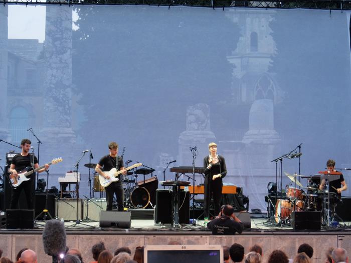 Depuis l'auberge, on écoute d'ailleurs, en s'installant dans un dortoir, les longues balances de la première partie théorique, Calypso Valois, parfaitement audibles par la fenêtre ouverte ! Et à vrai dire sur scène plus tard, il ne se passera pas grand-chose de plus : la demoiselle bien née (c'est la fille d'Eli & Jacno !) pratique avec son groupe une pop génétiquement marquée années 80, vaguement subversive par moment (Méchante Fille, façon Lio, pas mal !), sympatoche mais globalement pas trop marquante pour le moment. Le public de bonne composition (...les places à 42 euros, ça écarte quand même statistiquement les risques de crétins criant "à poil !"...) l'écoutera et l'applaudira poliment à la fin, profitant de l'occasion pour écraser en même temps quelques-uns des moustiques qui attaquent en piqué, selon la célèbre tradition arlésienne, à la bascule du jour...