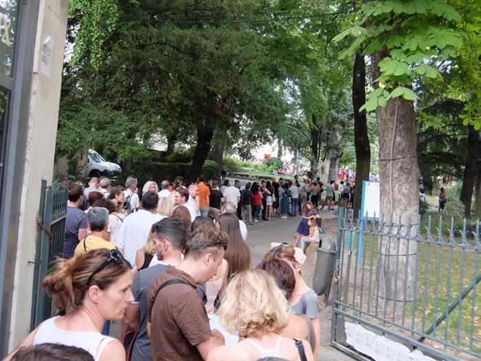 Un peu avant, on aura eu grand plaisir à revenir dans cet écrin magnifique qu'est le Théatre Antique (pas revu depuis un show stratosphérique de Sigur Ròs, il y a déjà quelques années). Hyper-organisé pour le coup (avec casse-croûte fait maison et une belle pinte de bière achetée sur l'Avenue des Lices), j'attendrai stoïquement, une petite demi-heure, que se rétracte enfin l'immense et double queue qui serpente dans le Jardin, avant l'ouverture des grilles du monument. Bien inspirés, les camions de crêpes et de glaces qui se sont placés là font leur chiffres d'affaire de l'année, parmi les spectateurs qui prennent ainsi leur mal en patience. Tout ça pour rentrer sur le site après un contrôle trop sympathique et/ou complètement nul - je ne pensais pas que le truc archi-éculé d'avoir sa bouteille d'eau pleine à la main pendant la fouille, marcherait encore quelque part...