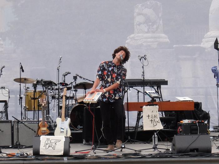 Dans le théatre nous attend, en première première partie inattendue donc, le jeune Teme Tan, reprogrammé ici par son label car une visite impromptue de... Jupiter, en hélico, l'a empêché de jouer un set prévu dans l'après-midi à Arles (au fait, j'adore ce t-shirt local anti-parisien qui dit : "En Arles, on dit à Arles !"). Bruxello-congolais ou le contraire, et nouvelle signature chez les Play It Again Sam, il chante plutôt joliment (avec une belle amplitude) sur des boucles électro ou guitare, relax ou entraînantes selon les titres, boucles qu'il empile au fur et à mesure en les enregistrant. Eminemment sympathique, parlant notamment de sa grand-mère puis de sa mère dans des chansons habitées, il parvient à faire participer le public dès le début, et même à le faire lever en grande partie à la fin. Pour ma part j'ai plutôt apprécié... jusqu'à ce que ça vire un peu trop afro à mon goût. Applaudissements finaux bien plus fournis néanmoins, que pour la miss qui l'a suivi.