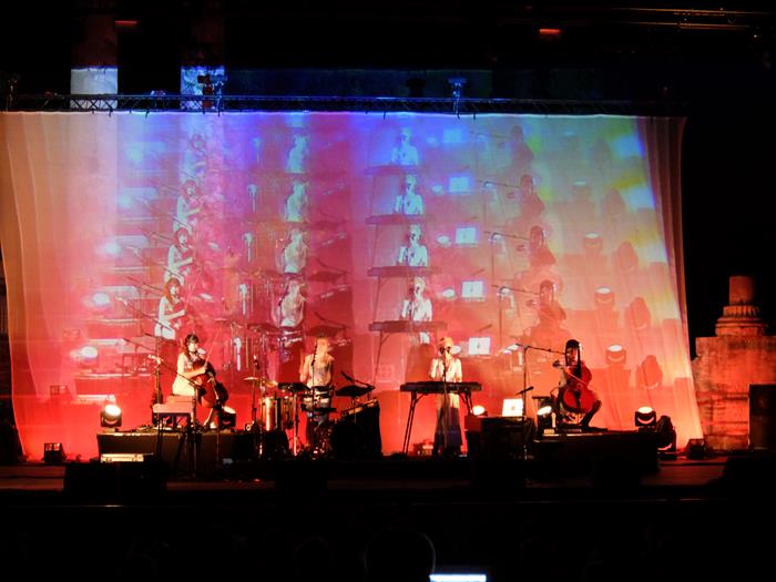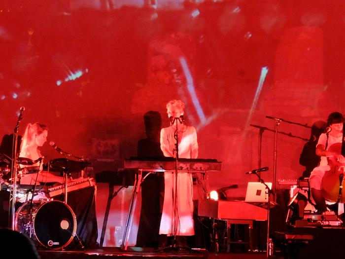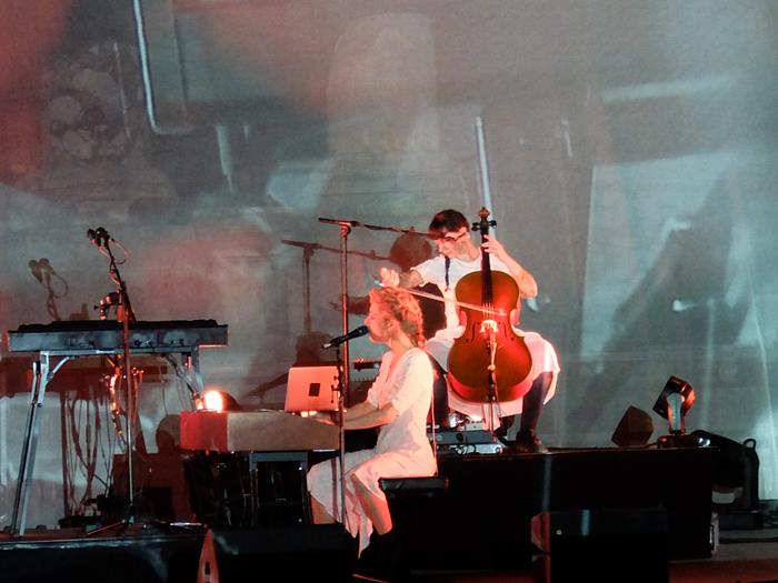 Après un looooong changement de plateau (et la tombée de la nuit), arrive le trio tant attendu (désormais quatuor, puisqu'il y a des percussions en plus) de la gracieuse Agnès Obel. Précisons tout de suite que devant une telle chanteuse à la voix cristalline, belle comme un coeur, magnifiquement vêtue et coiffée, et qui plus est drôle et pertinente dans ses interventions, le pauvre chroniqueur se retrouve totalement sans défense... Il ne tentera donc même pas de vous dire que certains visuels étaient trop chargés voire un peu moches, que c'est mal de ne pas laisser les photographes pros s'approcher (ce qui éviterait ce qui illustre la présente chronique, puisque mon camarade habituel des Eurocks, Andy Trax, y était !), que les images de micro-caméra en noir et blanc projetées sur une écran géant, c'est pas très beau, ou que le groupe marchait très bien sans percussions aussi... Ou encore que la belle nous a privé.e.s sans raison particulière de Philharmonics, de Aventine et d'autres de ses plus anciennes merveilles...