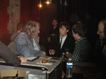 Et puis, 5 minutes après la fin, ils sont déjà à l'arrière pour vendre leur disques et parler aux fans, une grosse dizaine de personnes absolument ravies. Ils manifestent un intérêt sincère pour les retours des gens sur le concert - je passerai d'ailleurs un moment parler à chacun des trois, et à improviser au bic un flyer concertandco.com que j'ai évidemment oublié. Une fois n'est pas coutume, j'achète même un digipack pour leur faire signer et garder un bon souvenir - ils sont SI sympas qu'on en a envie d'acheter leurs disques, qu'on a pourtant téléchargés il y a 3 ans et écoutés mille fois ! Le batteur blondinet me confie être assez content de ce soir et n'avoir pas été choqué par la salle aux deux tiers vide, qu'il a vu pire - il faut dire qu'il a l'air de bonne composition !