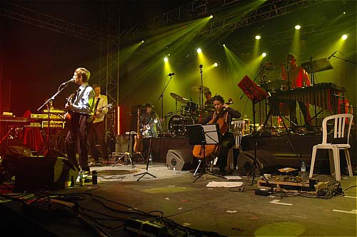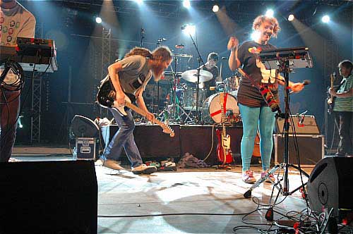 Ils sont 7 sur scène, le batteur joue le premier morceau debout, c'est pas mal, une espèce de pop foutraque, ça part un peu dans tous les sens... Un peu comme l'ambiance en ce début de soirée, un mélange biere-kebab-chichon qui colle pas mal de monde sur les marches de l'esplanade.