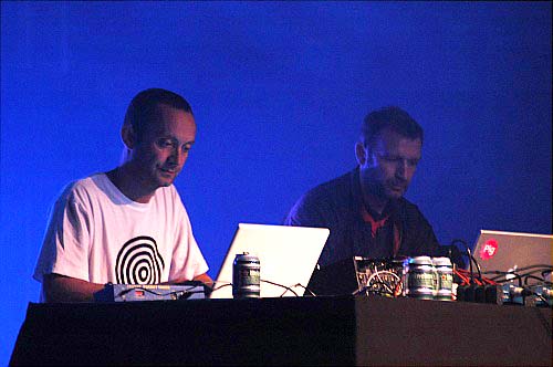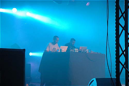 Dans l'autre tente, Swayzak a commencé son set. On nous annonce un live sur le programme... et on voir juste deux types en train de gigoter devant leurs ordi portables (à quand un concert avec une clé USB ?), avec derrière eux, l'inévitable projection d'images subliminales, histoire de remplir le vide et de donner aux spectateurs quelque chose à regarder sur la scène.