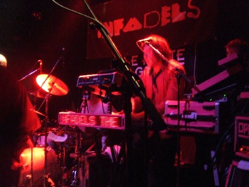 The Infadels se présentent à 5, quand même, autant dire avec ceinture et bretelles (que certains portent aussi en vrai d'ailleurs), look gentiment excentrique assez porté sur le noir, le blanc et le rose fluo. Ils semblent sincèrement contents d'être là (il faut dire que leur 20 fans locaux font un boucan d'enfer et dansent avec enthousiasme).