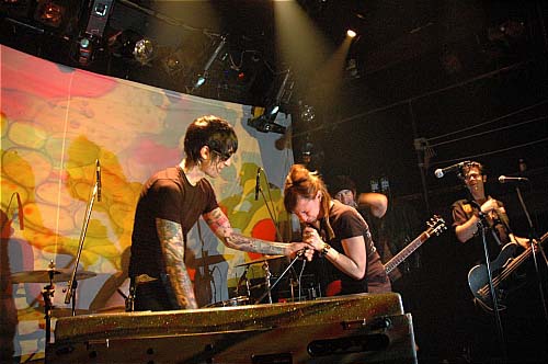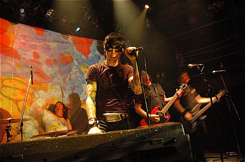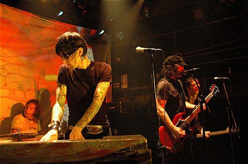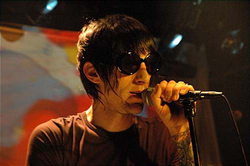 Petite déception quand ils arrivent ; d'après ce que j'en avais lu, je m'attendais à un look plus biker (moustache, cheveux, bide à bière) et non : fringués en noir sans excès, dégaine de jeunes poseurs et rock stars en devenir - rien à voir avec le style Supersuckers que j'espérais. Pas non plus le côté un peu kitsch du poète-maudit-chevelu-en-cuir style B.R.M.C.. Ben non, faut bien l'avouer : grand et affuté, bras tatoués et d'énormes lunettes de soleil disons-le, le chanteur/joueur d'orgue farfisa Jack 'Preacher' Cavalier aurait même carrément la classe.