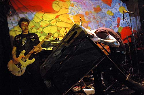 Bref le groupe envoie du très gros volume sonore, qui noie un tant soit peu en live les nuances éventuellement psychobilly, stoner et autres qu'on percevait sur album : G-A-R-A-G-E, point barre. En fait une image me revient en permanence : si on enlève le son d'orgue, on dirait les Stooges jouant à la Maison Hantée sans avoir fait la balance... Notamment dans la façon qu'à le chanteur de s'exprimer, plus proche des aboiements de James Osterberg que du chant de Rob Tyner du MC 5 dont se revendique pourtant le groupe ... Mais enfin il y a des comparaisons moins flatteuses : sa voix est puissante et hargneuse, que demande le peuple ...