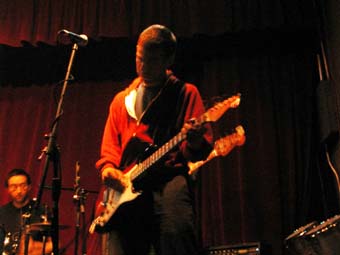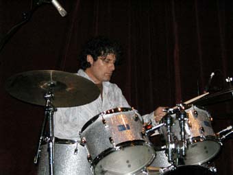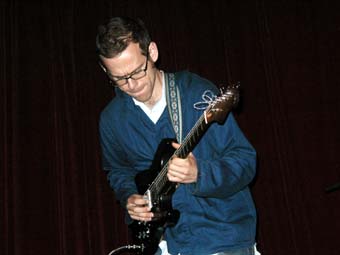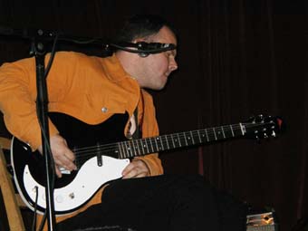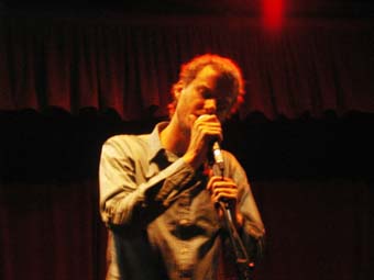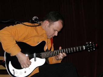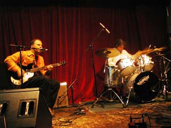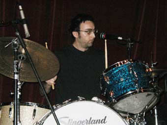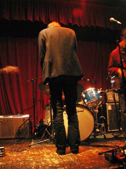 Apres un "OKAYYY" qui contrastait pas mal avec le recueillement de cette première partie, il est allé s'installer sur la chaise a cote rejoint par Hamish Kilgour a la batterie étincelante (assortie a ses chaussures - sorte de botes spatiales). Ils ont commence par un long instrumental, ou le jeu de guitare de David est, comme son jeu au piano, plein de changements.