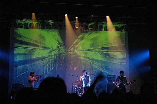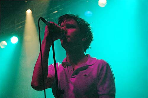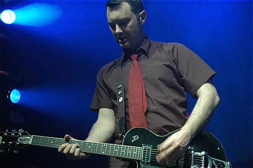 Un peu plus calme, Work work work qui m'a toujours rappelé, je ne sais pas pourquoi, le film Trainspotting. Puis The Guilt qui sonne tout à fait énorme en live, ainsi que l'hypnotique T-Bone qui rappelle plaisamment Joy Division (en plus énervé bien sûr). Le chanteur annonce alors une série de trois chansons tristes (ce qui ne veut pas dire calme heureusement, on commençait à peine à s'amuser !) : une bombinette disco-punk non identifiée, puis Open Book au refrain débile et jouissif ("ohohohoh, ohohohoh", les Kaiser Chiefs en ont fait un album entier comme ça !), puis Binary Love, une de mes préférées et qui est probablement leur mélodie la plus écrite (c'est quasiment de la pop !).