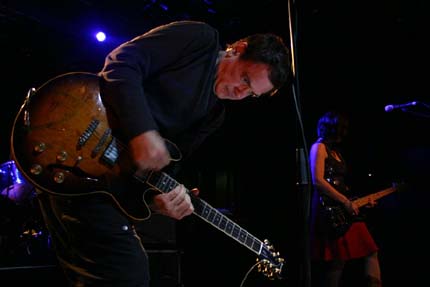 La spécialité de David Gedge, le son du Wedding Present, c'est une manière de jouer frénétiquement de la guitare, en grattant les cordes par saccades. Ca doit faire mal au poignet, en tout cas, ça ne fait pas du bien aux cordes. A la fin de chaque chanson, pratiquement, une accorte guitar-tech, vient lui tendre un nouvel instrument, fraichement cordé.