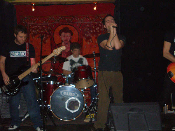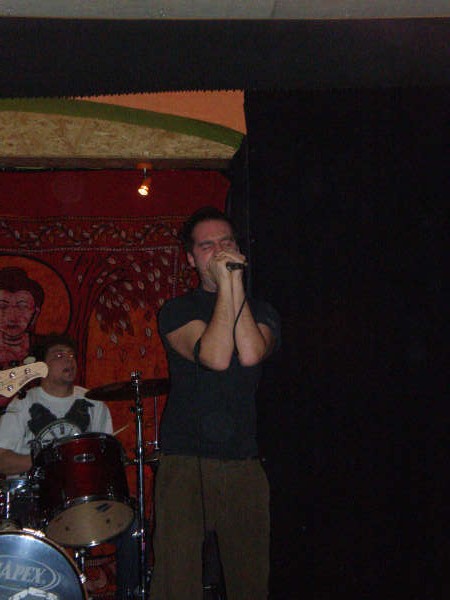 Après un très rapide interlude de musique en boîte, les italiens de Fatty Chaos viennent déchirer nos tympans avec un punk/grunge vociférant. Kontu, le chanteur, je me dois de vous le décrire !! Physiquement, il faut s'imaginer le chanteur de Dyonisos un peu plus remplumé toutefois, vocalement (humm, les seules réf en tête risquent de n'être connues que d'un petit nombre) vous vous imaginez plié en deux de douleur avec en sus un mal de tête à vous en faire exploser le crâne et vous poussez de toutes vos forces un cri démentiel tout droit venu de vos tripes. Ah oui, vous rajoutez à Kontu une allure de pantin désarticulé qui n'a de cesse d'enrouler/dérouler le fil de son micro autour de ses bras entre deux convulsions.