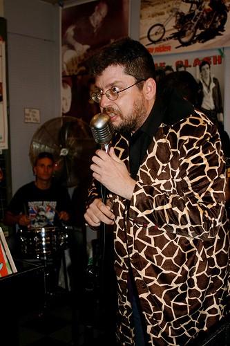 La soirée commence par un happening en compagnie de The Kokomo's, un excellent trio entre rockabilly et psychobilly, responsable en temps normal de concerts à la fois fiévreux, hilarants et mémorables... Le problème c'est qu'aujourd'hui, Elvis Leaderprice, le "frontman" du groupe, n'a pas envie de chanter à la Coopé (mauvais accueil ?), il a des envies de faire la révolution, il trouve les gens apathiques - une poignée de fans de rock - et il a juste envie de montrer sa colère... Mais à sa manière d'anarchiste nonchalant : c'est à dire calmement, en faisant la grève du zèle ! Entre deux ou trois facéties vocales dont il a le secret (le fameux hoquettement qui rend fou), notre homme chante au milieu du public, ou assis et complétement avachi sur les retours, sinon il invite les gens à monter sur scène, à vociférer à sa place ou à faire une chenille endiablée dans la salle pendant que le batteur et le guitariste - les pauvres ! - s'échinent sur leurs instruments... Si c'est souvent drôle, on sent néanmoins au fur et à mesure que le concert se déroule que le mal est profond : Elvis Leaderprice a l'impression de faire un boulot pour une salle et un public avec lesquels il ne se sent pas du tout en phase. Même les tentatives de ses amis (dont le hurleur des ex Thee Didier Veillaults) pour le faire se relever en le portant ou le forcer à se saisir du micro en l'étranglant sauvagement n'y feront rien... A suivre dans un autre contexte, les aventures des Kokomo's !