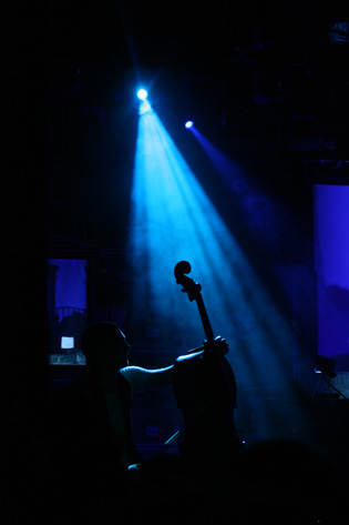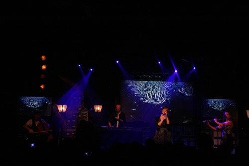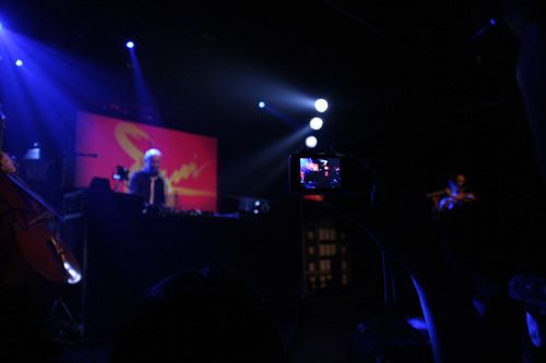 21h34. Après une petite bière, les choses sérieuses peuvent commencer. La salle est maintenant bien remplie (aux alentours de 400 personnes, mais je n'ai jamais été bon pour ce type d'estimation). Si les lumières diminuent, l'ambiance, elle, monte très vite. Et ce n'est pas (uniquement) dû à l'absence totale de climatisation. Wax Taylor, accompagné de ses musiciens (Ludivine Issambourg à la flûte traversière et Mathieu Detton au violoncelle) rentrent sur une scène à l'atmosphère urbaine, avec immeubles, lampadaire et grands écrans.