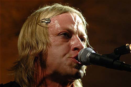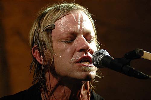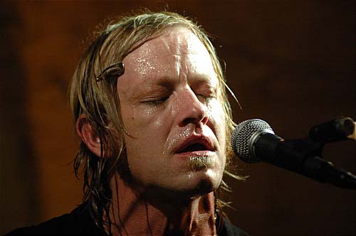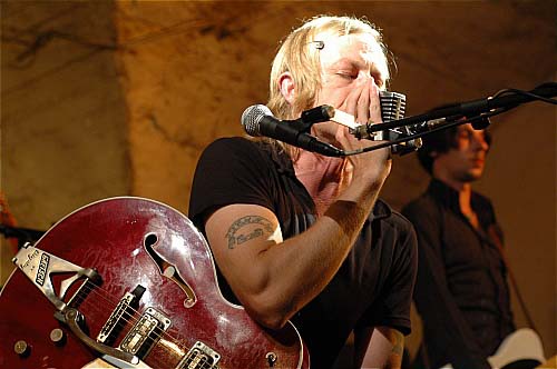 Avec ses cheveux d'un blond immaculé, son regard bleu perçant et son visage tout en angles carrés (qui fait également penser au non moins expressif Willem Dafoe), David Eugene Edwards nous a entraîné durant 1h30 dans sa quête d'absolu et de rédemption. Son arme à lui, c'est un Gretsch rouge qu'il pousse dans ses derniers retranchements.