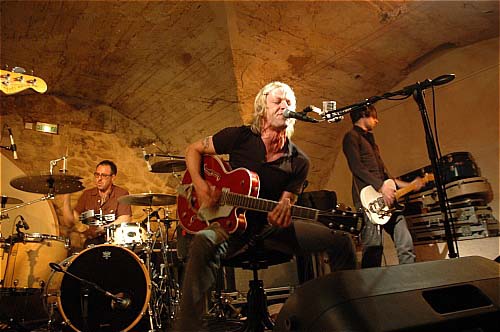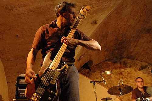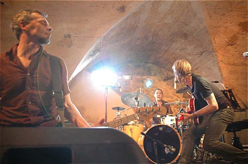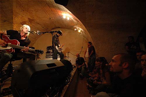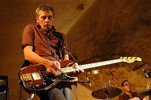 A sa droite, le second guitariste, plus jeune, forcément discret, s'attachera à soutenir le déluge de larsens qui a envahi la cave de l'Espace Doun.